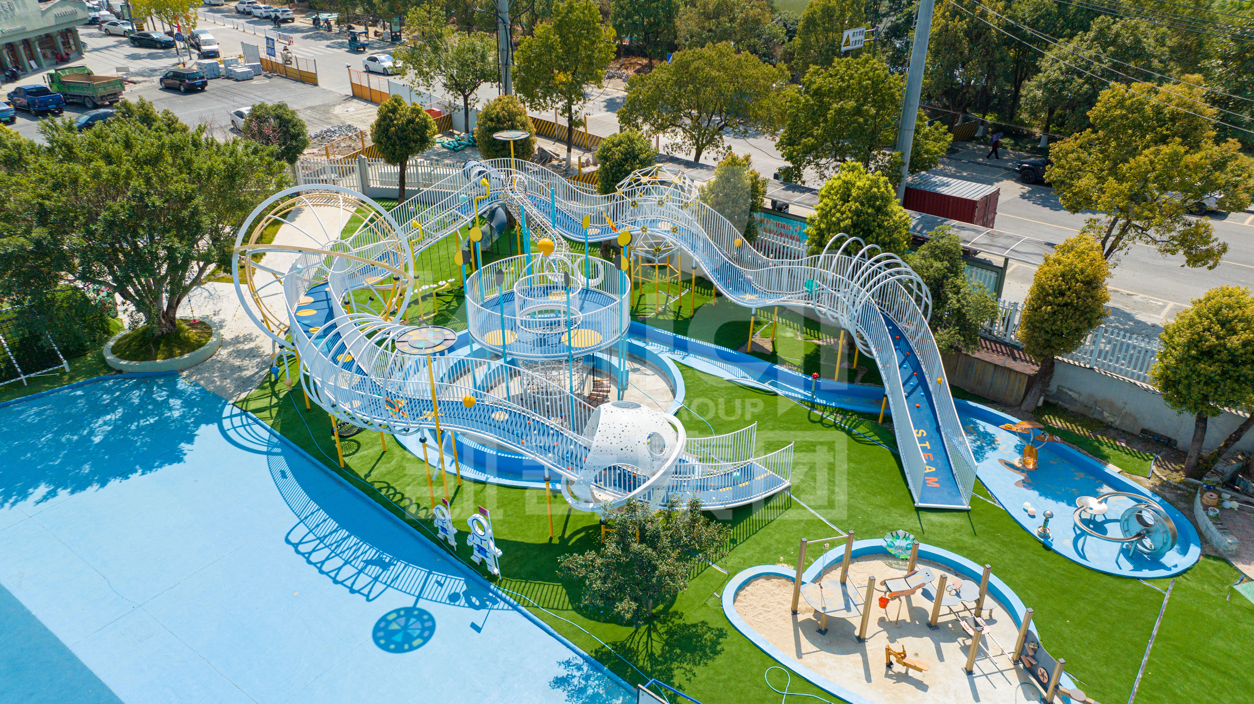 場地空間提取太空星球元素,場地包括星球廊橋、地形爬網(wǎng)、玩沙設(shè)施、室內(nèi)游戲設(shè)備等多種游戲設(shè)施。豐富多樣的活動設(shè)施可滿足孩子們鉆、爬、跑、跳等各種活動需求。為孩子們打造一片可以休憩、游戲、學(xué)習(xí)、活動的成長體驗(yàn)空間。